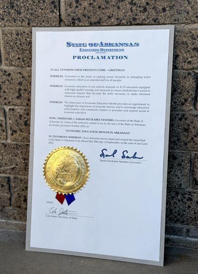 Governor Sarah Huckabee Sanders formally proclaimed October as Economic Education Month in Arkansas, recognizing that economic literacy is "an essential skill for all people" and that quality economic education helps students "develop the skills necessary to make informed choices as citizens."